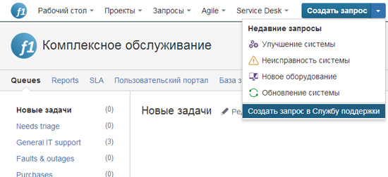 Выбор сервисаВ панели инструментов найдите кнопку "Создать запрос". Щелкните стрелочку вниз и выберите кнопку "Создать запрос в службу поддержки". Далее необходимо выбрать "Комплексное обслуживание".Если ваш запрос связан с проектной деятельностью или другими услугами Ф1СОФТ.РУ, вам будут доступны дополнительные опции в меню. |