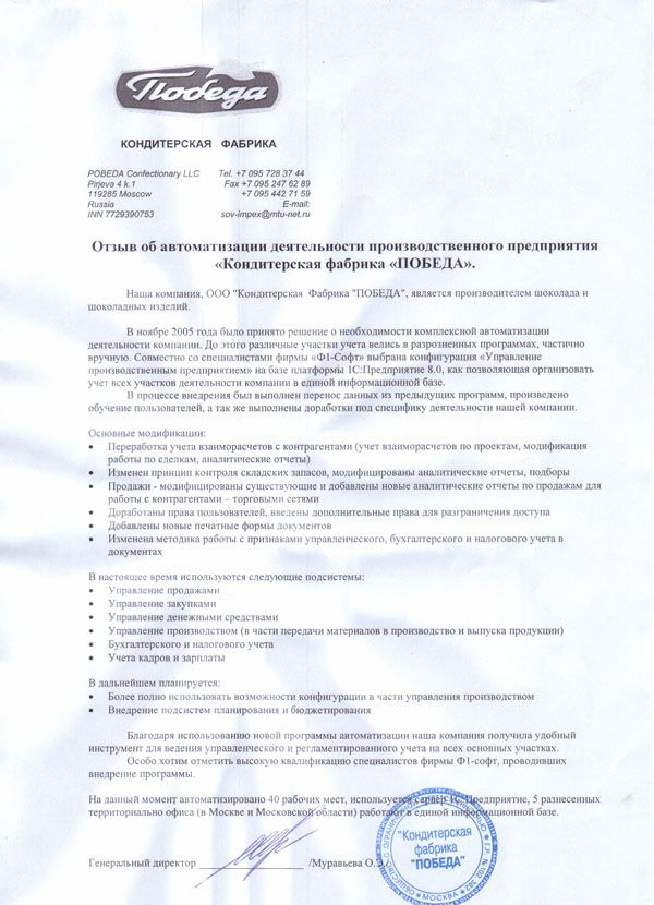 Кондитерская фабрика «Победа» представляет огромный ассортимент шоколадных изделий по доступным ценам. Конфеты, шоколадные плитки, вкусные подарки на все случаи жизни производятся из натуральных ингредиентов при полном соблюдении технологии. Продукция компании популярна во всей России и за рубежом. Растущие продажи — лучшее подтверждение нашей добросовестной работы.