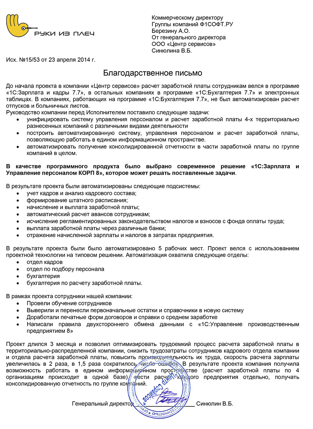 Проект длился 3 месяца и позволил оптимизировать трудоемкий процесс расчета заработной платы в территориально-распределенной компании, снизить трудозатраты сотрудников кадрового отдела компании и отдела расчета заработной платы, повысить производительность их труда, скорость расчета зарплаты увеличилась в 2 раза, в 1,5 раза сократилось число ошибок. В результате проекта компания получила возможность работать в едином информационном пространстве (расчет заработной платы по 4 организациям происходит в одной базе), вести расчет каждого предприятия отдельно, получать консолидированную отчетность по группе компаний