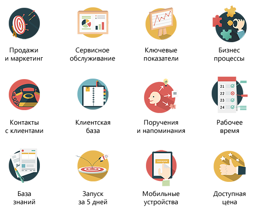 - Управление временем (тайм-менеджмент), подсистема оповещений, управление продажами на основе бизнес-процессов