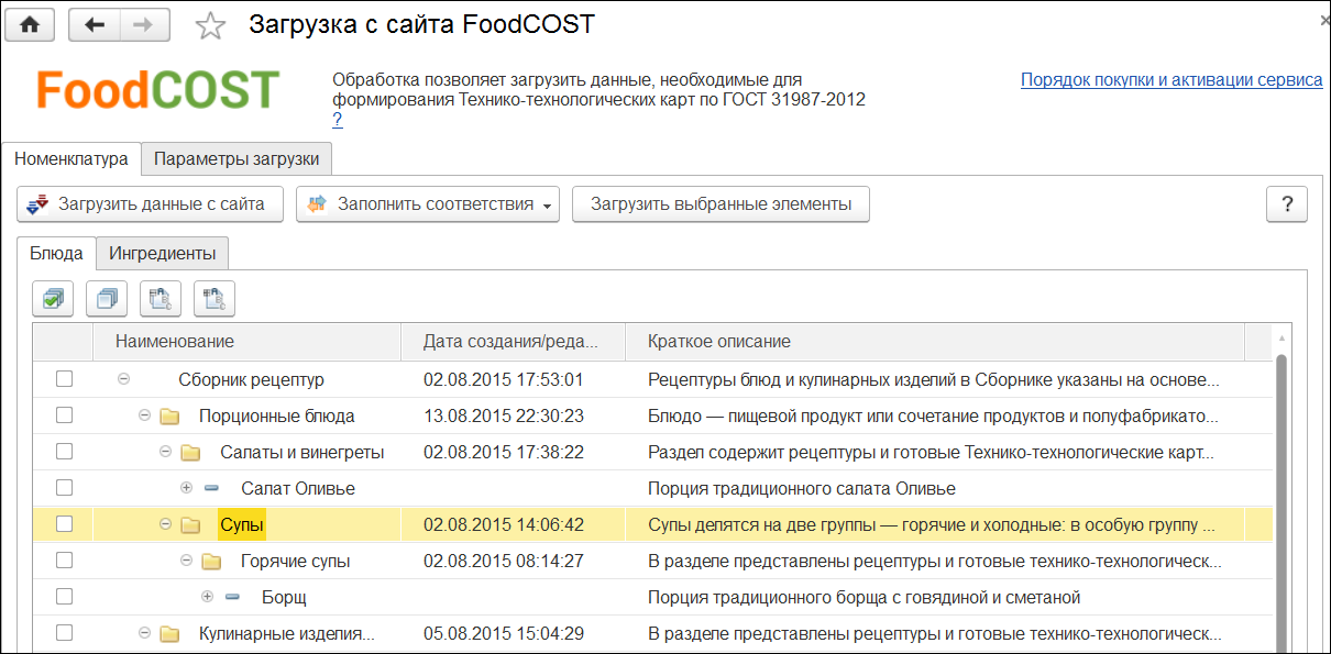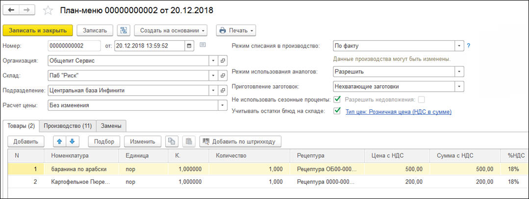 - для блюд, приготовление которых требует сложных рецептур, выполняется система учета «блюдо в блюде». При этом количество уровней сложности здесь неограниченно;