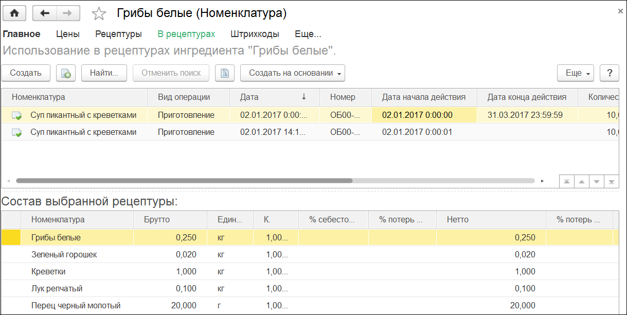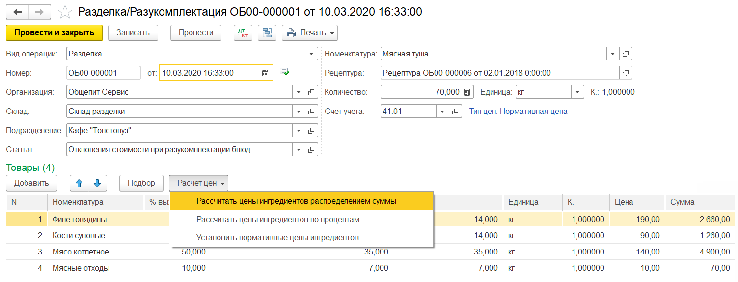 - хранение списка рецептур в виде документов, для которых выбирается конкретная операция (приготовление, разделка либо разукомплектация);