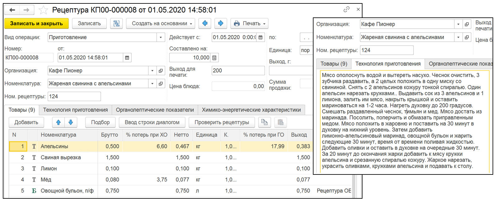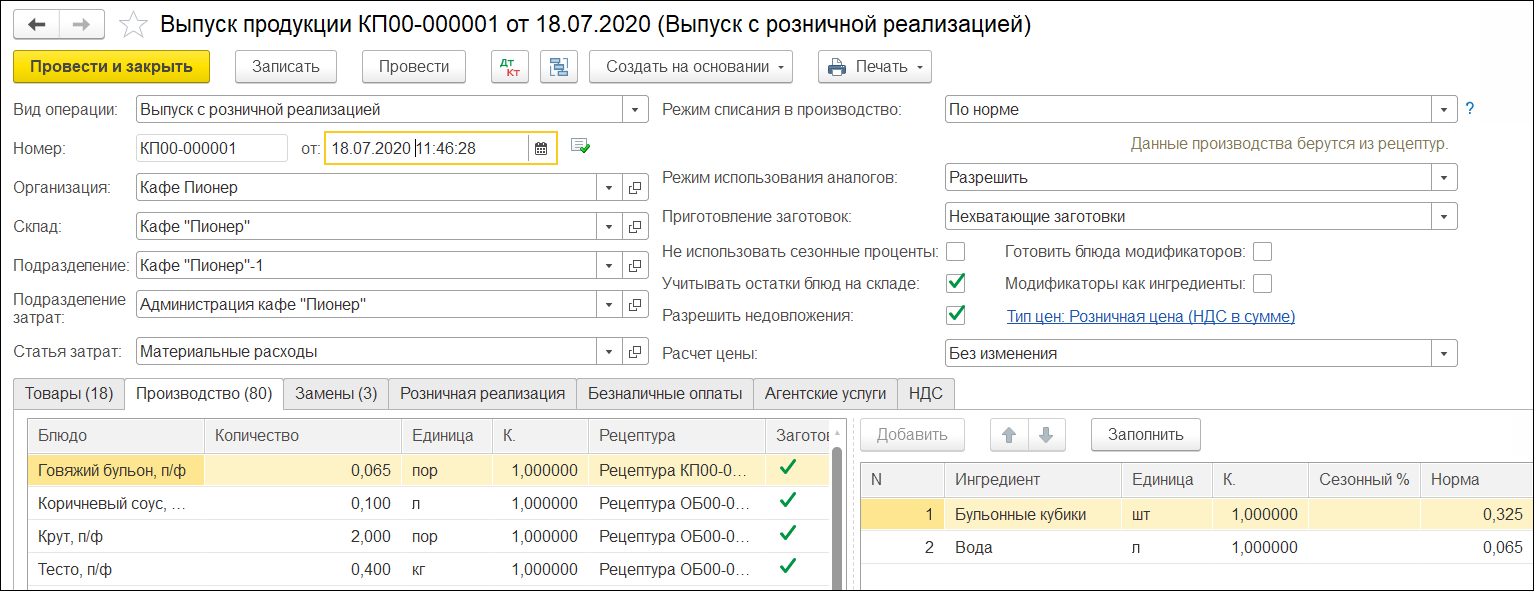 - по заведенным ранее рецептурам учет приготовления блюд и полуфабрикатов, а также сумм и количества ингредиентов, которые списываются в производство;