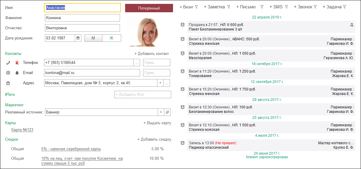 - развернутый отчет по клиентам (частота посещений, загруженность мастеров, отмененные записи, объем продаж и пр).