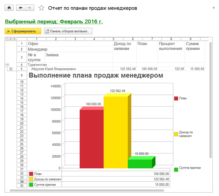 - учитываются заявки туристов в соотношении туров, менеджеров;