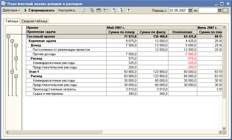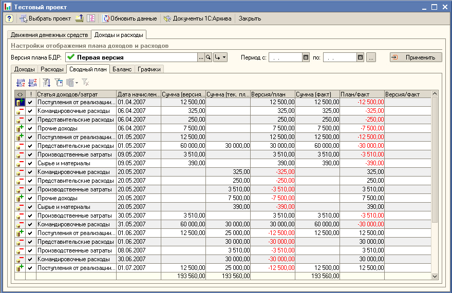 На уровне бюджетов проекта система позволяет производить:- План-фактный анализ бюджета доходов, расходов и движений денежных средств по проекту в разрезе проектных задач, статей бюджета, контрагентов, договоров и календарных периодов.