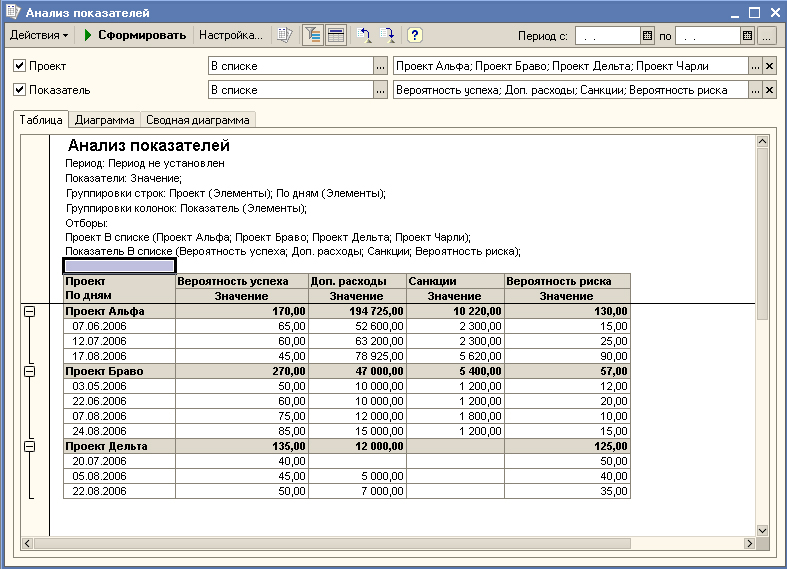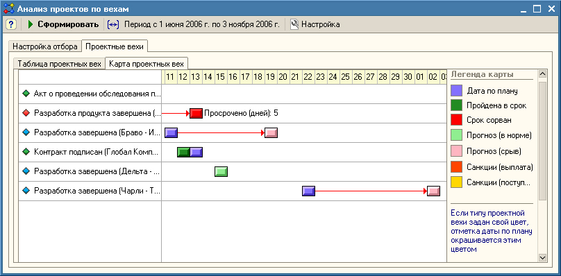 - Анализ контрольных событий непосредственно портфеля проектов. Инфо о контрольных событиях различного рода проектов сводится в одном представлении. В случае потенциально реального или фактического срыва сроков выполняется расчет планируемых финансовых санкций. Итоги проведенного анализа понадобятся для того, чтобы принять решение в ходе финансового/оперативного контроля деятельности предприятия.