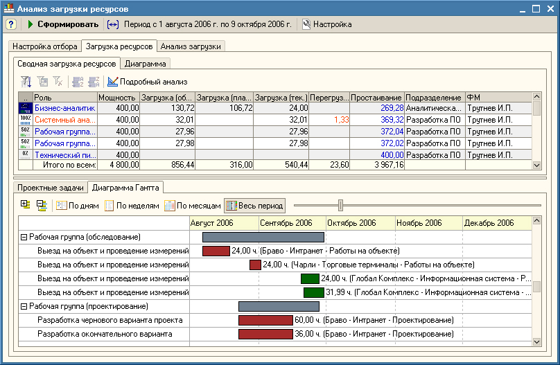 - Анализ фактической и запланированной загрузки ресурсов, выявление «недогруженных и «перегруженных» трудовых ресурсов.