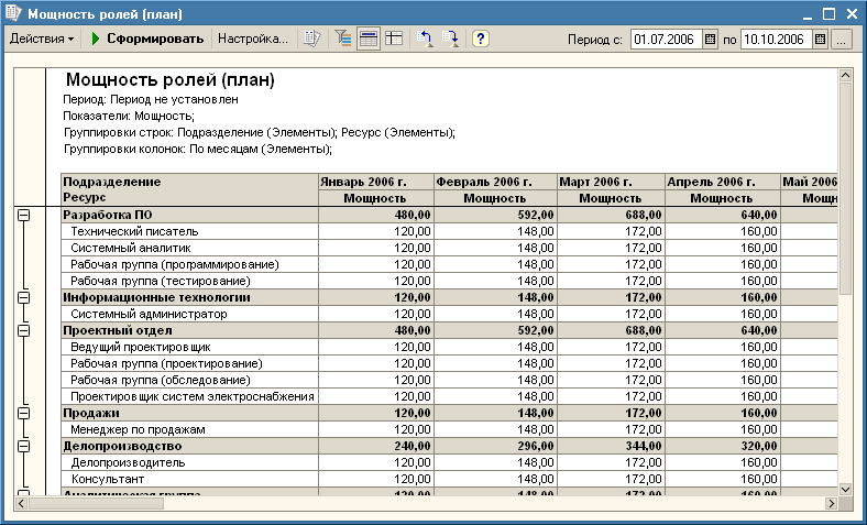 - Моделирование ограничений предприятия по ресурсам путем введения в систему для каждой из специальностей плановой мощности. Сопоставление фактической и плановой мощности специальностей трудовых ресурсов, нахождение «узких мест».