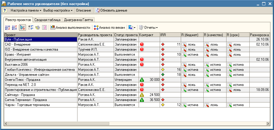- Анализ состояния/динамики колебаний ключевых показателей проектов, которые входят в программу либо портфель. Значения ключевых показателей вводиться могут, как вручную руководителями проектов, так и автоматическим образом рассчитываться системой, только если исходные данные имеются в информационной базе.