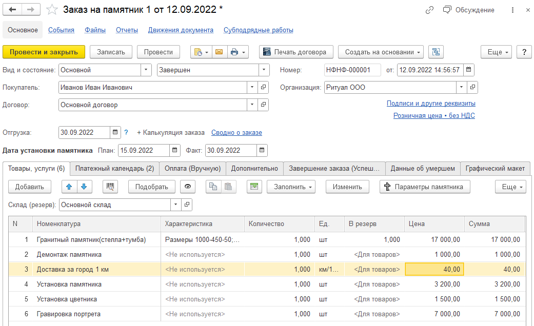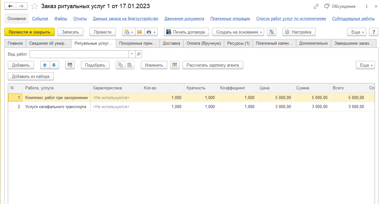 Функционал программного продукта «1C:Управление ритуальными услугами» предназначен для автоматизации процессов обработки заказов на ритуальные услуги, производства ритуальных принадлежностей, установки памятников и предоставления услуг автотранспорта.