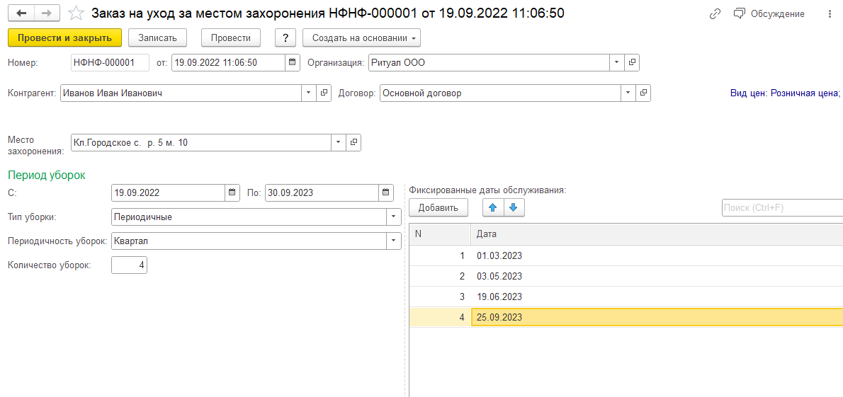 Отраслевое решение «1С:Предприятие 8. Управление ритуальными услугами» предоставляет следующие возможности: • ведение учета усопших; • учет льгот и государственных компенсаций по затратам на захоронение отдельных категорий граждан; • учет захоронений; • оформление заявок на выезд к заказчику; • оформление заказа на получение необходимых для организации похорон документов; • оформление заказа на проведение обрядов; • оформление прижизненного договора на оказание ритуальных услуг; • оформление заказа на прочие ритуальные услуги; • оформление заказов на установку и изготовления памятников, оград и т.п.; • оформление заявок на разработку дизайна памятников и захоронений; • контроль установок памятников, отслеживание готовности памятников и другой продукции; • предварительный ввод и расчет гравировок; • классификатор эпитафий и лент; • оформление мест захоронения; • планирование уборок мест захоронения, подготовка мест захоронения к зиме; • поиск места захоронения; • автоматизация абонентских услуг по благоустройству и дальнейшему уходу за местами захоронения; • инвентаризация захоронений; • формирование полноценной информационной картины о погребении.Прайс-лист «1С:Управление ритуальными услугами»