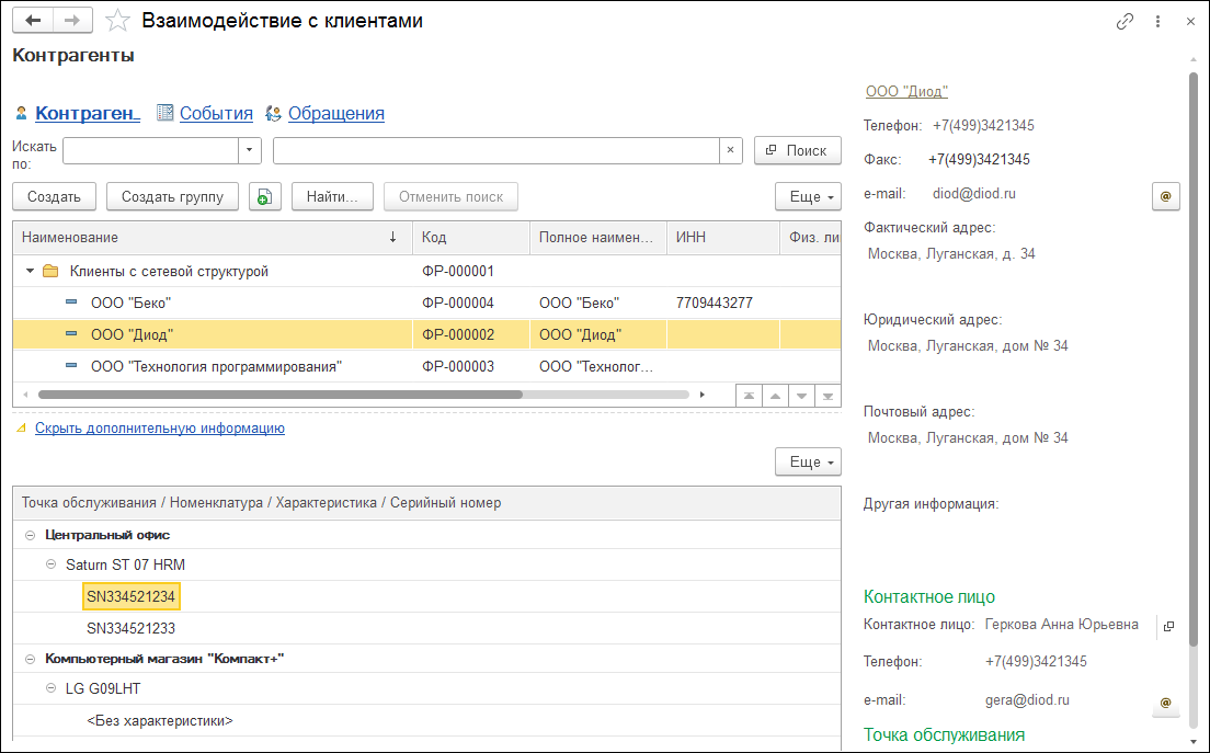 - регистрация и хранение списка контактных лиц контрагентов и их контактной информации;